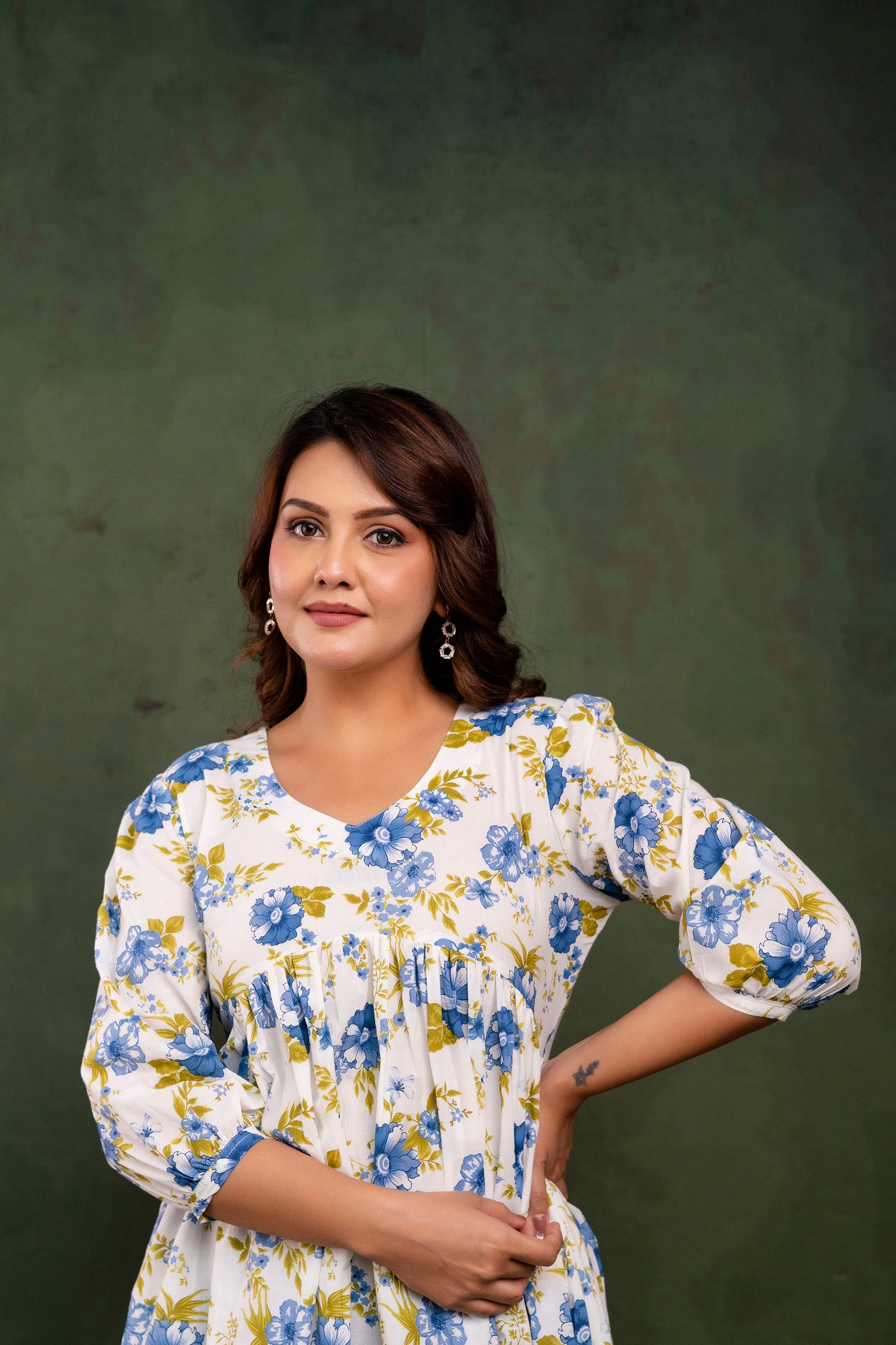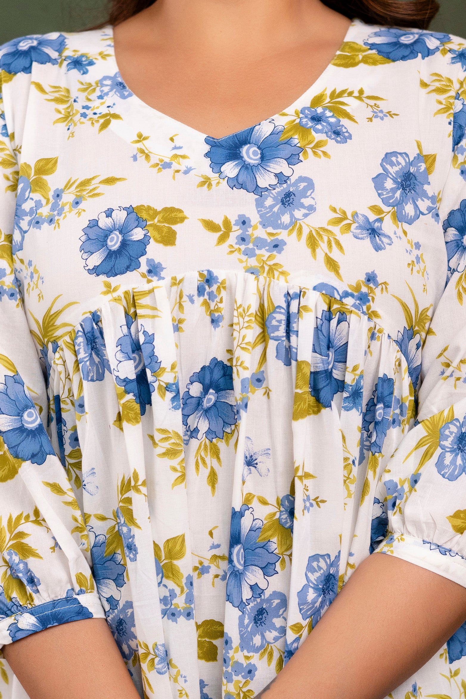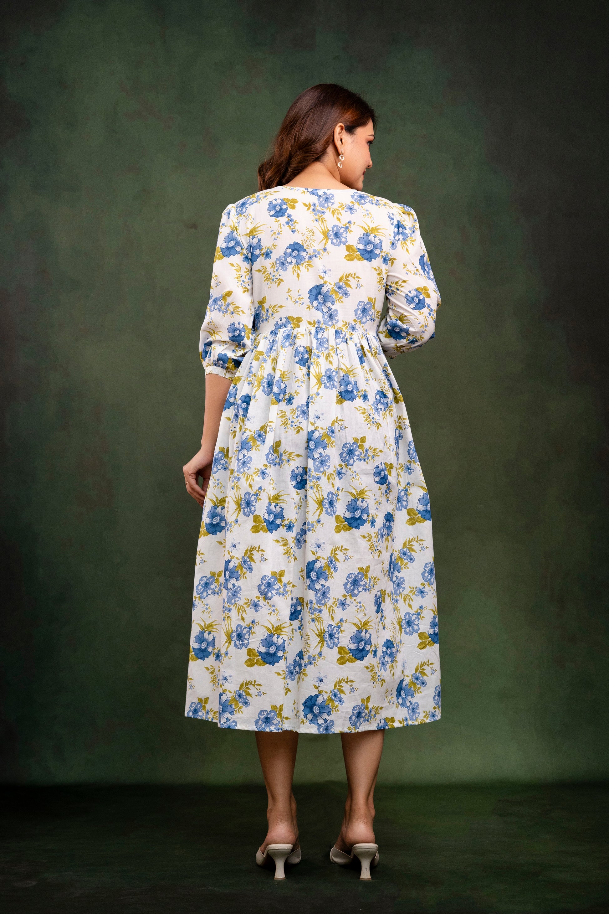 Step into timeless charm with our Cotton Midi Dress, crafted for comfort and grace. Made from breathable, high-quality cotton, this dress features a flattering midi length and a relaxed silhouette that moves with you. The soft floral print adds a touch of whimsy, while the gathered empire waist and three-quarter sleeves offer a refined, feminine finish.