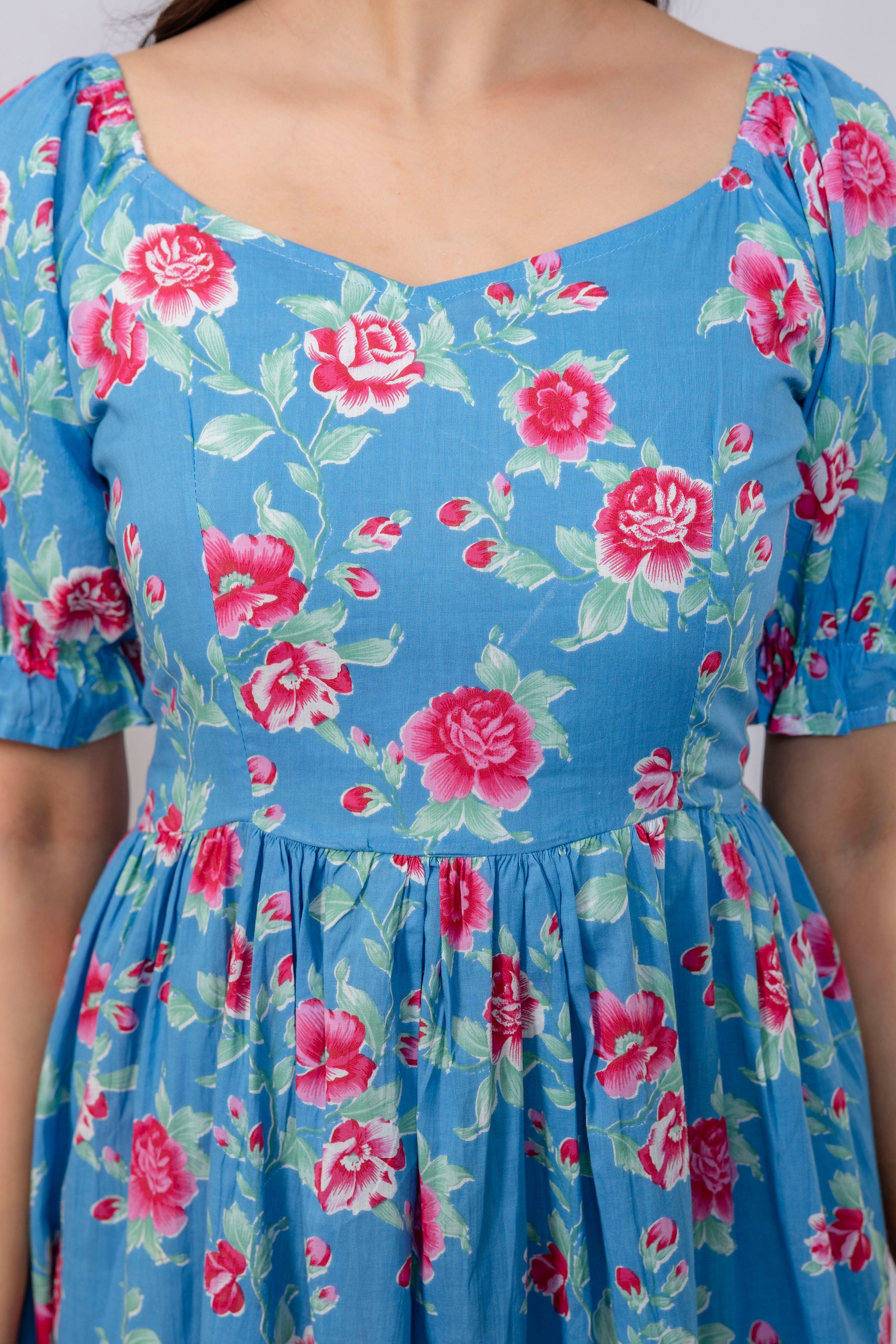 Floral Pattern: A vibrant blue base adorned with pink floral prints creates a refreshing, feminine look suitable for both casual and semi-dressy occasions.